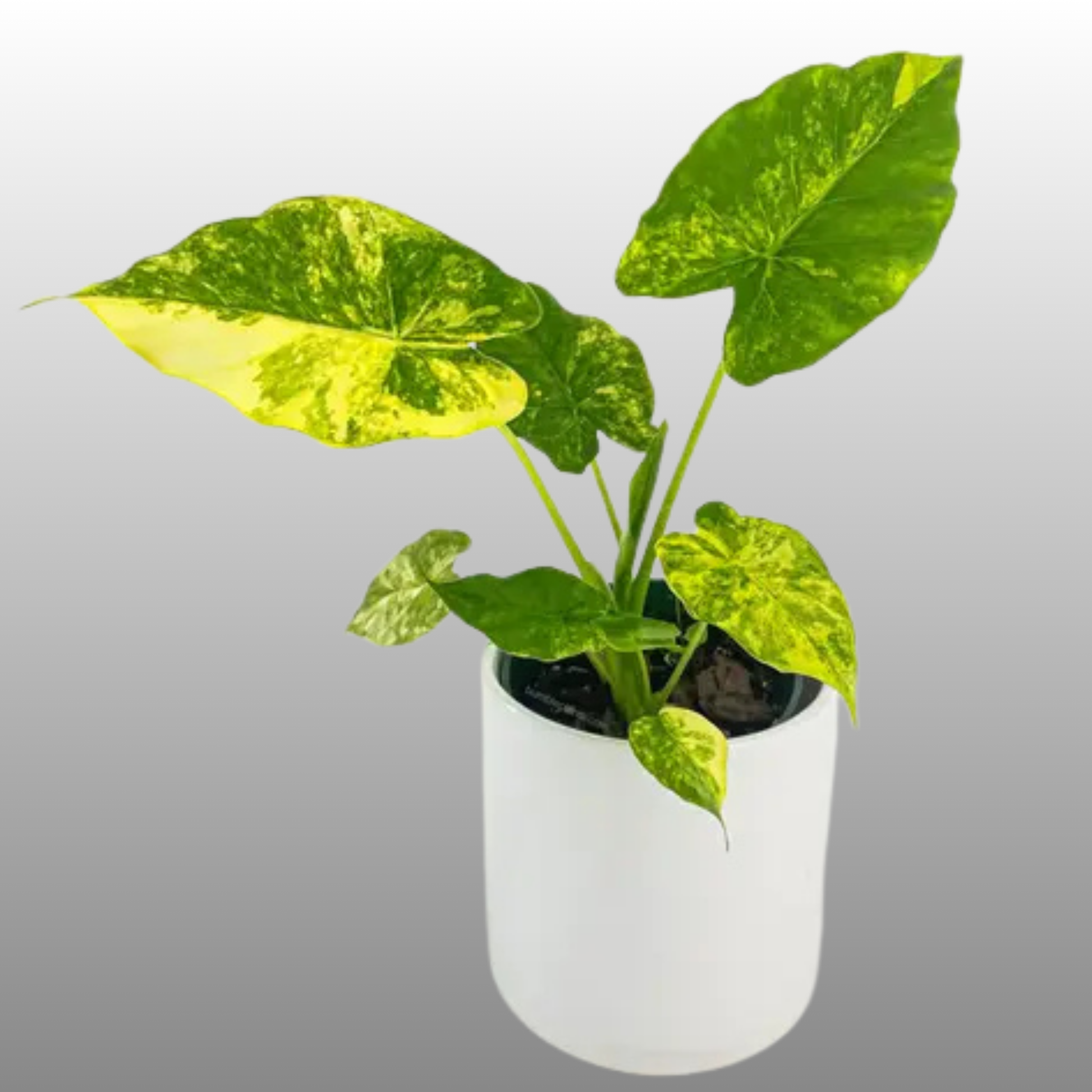 Lush, expansive, and radiant — Alocasia Gageana Aurea pairs broad, tropical foliage with warm golden variegation for a statement that feels both bold and refined. The large, shield-shaped leaves emerge vibrant green, brushed with tones of yellow and chartreuse that shift naturally across the surface.