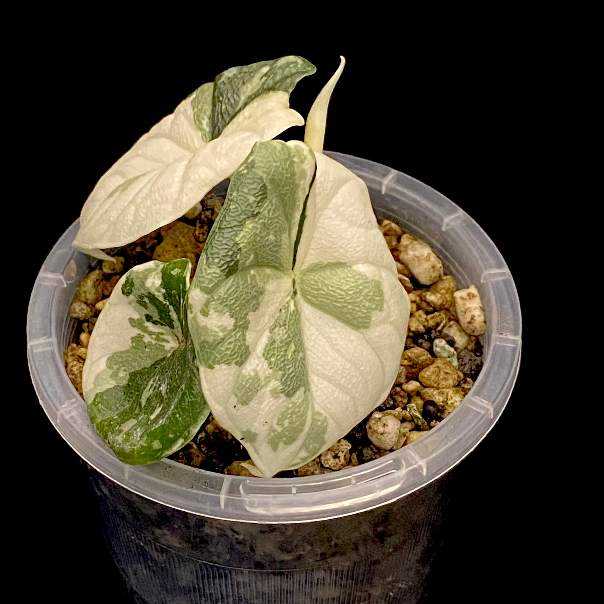 Turn heads with the Alocasia Melo Albo — a rare and striking form that blends bold texture with creamy variegation.