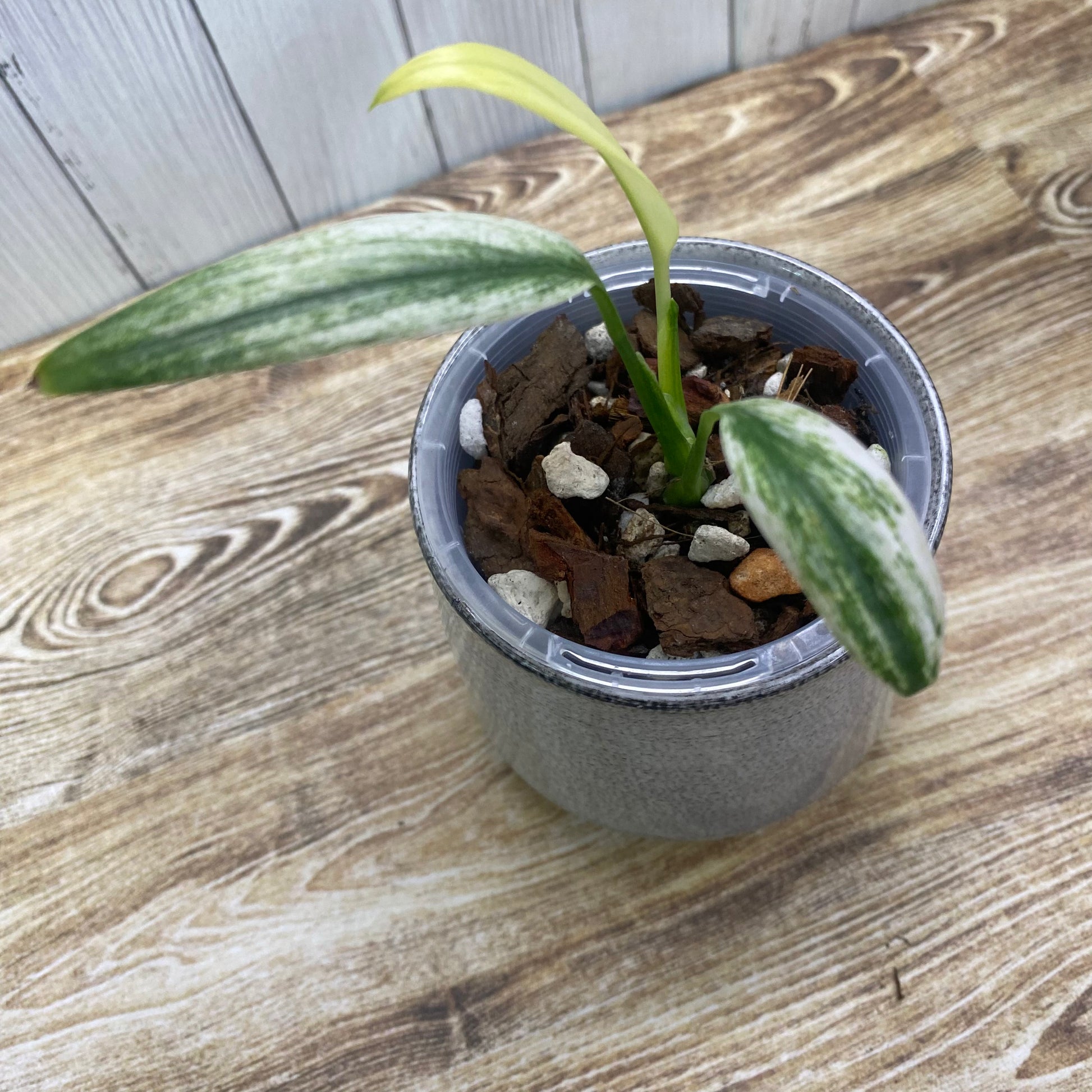 Each leaf develops with subtle variation, ranging from soft silver washes to sharper white streaks and sectoral highlights. As the plant matures and begins to climb, the foliage elongates further and the contrast becomes more pronounced, creating a sleek, architectural display.
