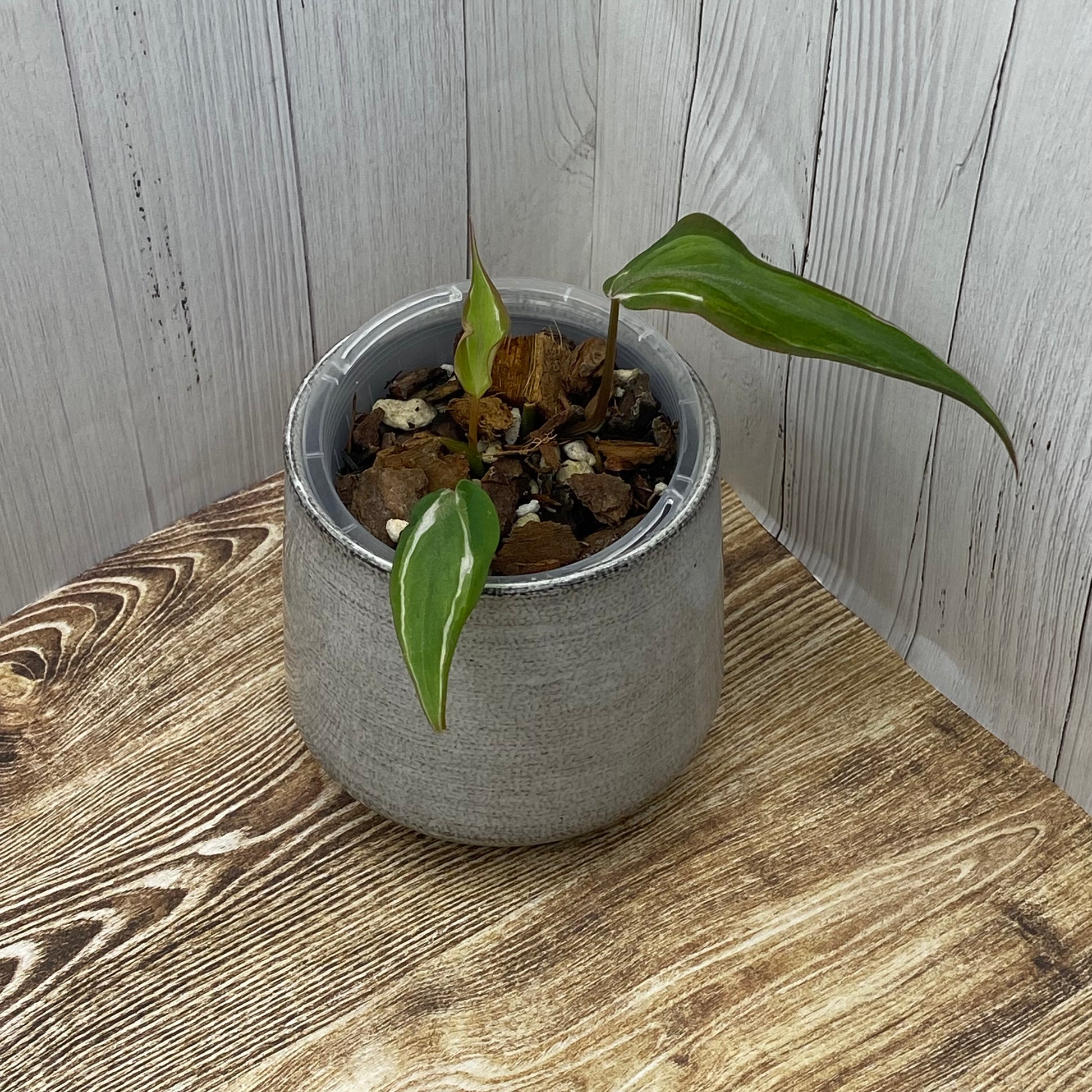 Delicate, expressive, and quietly captivating — Philodendron Halo Velvet Micans Variegated elevates the classic micans velvet with soft variegation and subtle halo-style contrast along the leaf margins. The foliage emerges rich bronze-green, layered with tones of cream and pale yellow that drift organically across the plush, velvety surface.